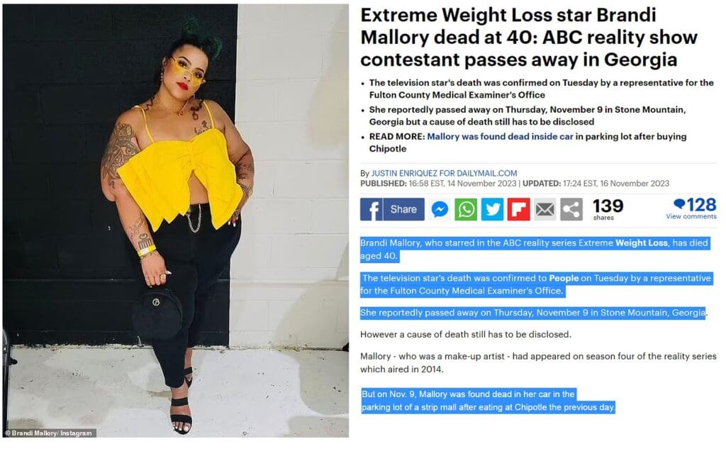 9. studenog 2023. Reality TV zvijezda, 40-godišnja Brandi Mallory pronađena je mrtva u svom automobilu 09. studenog 2023. na parkiralištu trgovačkog centra nakon što je prethodnog dana jela u Chipotleu.