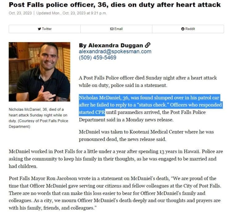 22. listopada 2023., Post Falls. 36-godišnji Nicholas McDaniel, policajac iz Post Fallsa pronađen je u svom patrolnom automobilu nakon što nije odgovorio na “provjeru statusa” i iznenada je preminuo istoga dana.