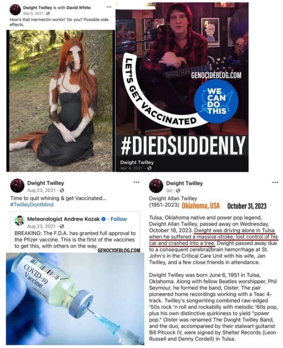 18. listopada 2023., Dwight Allan Twilley vozio je sam kada je doživio snažan moždani udar, izgubio kontrolu nad svojim automobilom i zabio se u stablo. Nedugo nakon toga preminuo je od posljedica krvarenja u mozgu. Ismijavao je Ivermectin i objavio je objavu: ”Vrijeme je da prestanete kukati i da se cijepite”!