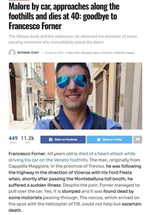 8. listopada 2023., Italija. 40-godišnji Francesco Forner doživio je srčani zastoj tijekom vožnje. ”Njegovo beživotno tijelo i zaustavljeni automobil privukli su pažnju vozača u prolazu”.