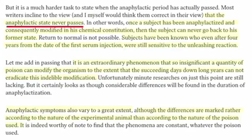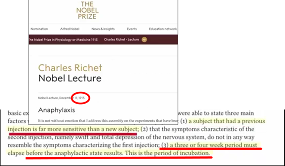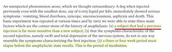 1902. je primijećeno da subjekt koji je imao prethodne injekcije je puno senzitivniji nego novi subjekt (zato oni koji su primili cjepivo protiv gripe s nekim istim toksičnim dodatkom kao u Covidu  imaju puno stravičnije reakcije na Covid-cjepivo nego oni koji nisu bili cijepljeni protiv gripe). Moraju proći 3 ili 4 tjedna prije rezultata anafilaksijskog stanja. To je period inkubacije prve doze.