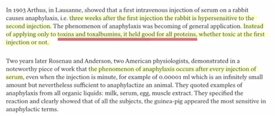 Nobelovac Richet nastavlja dalje: Izuzetan je fenomen da tako beznačajna količina otrova može modificirati organizam u tom opsegu da uspješni kasniji dani ne mogu poništiti neizbrisivu modifikaciju  (i sad, kad vam kažu da su u cjepivima zanemarivo male količine žive, aluminija i ostali otrovne pomoćne tvari,  njihova svrha je razboljevanje).