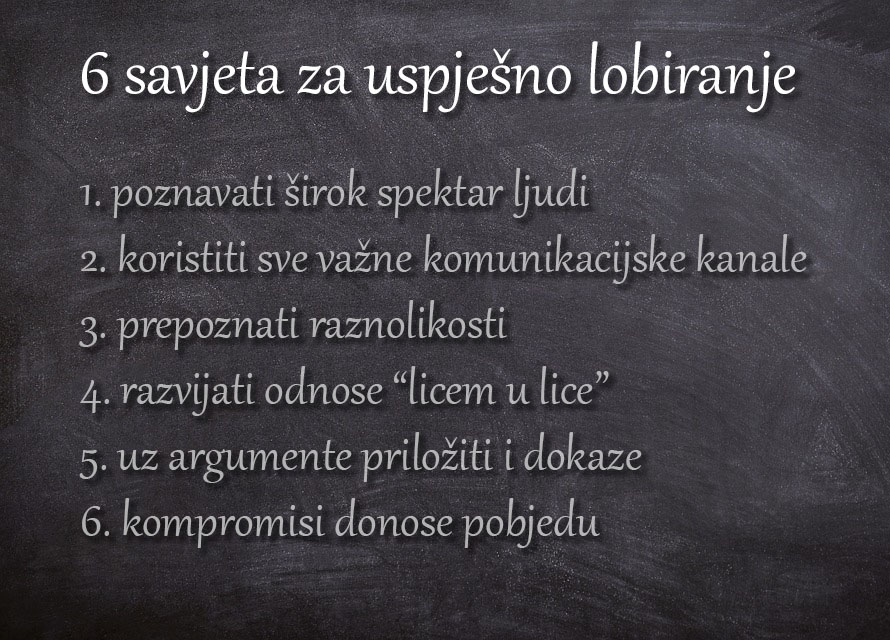 - Upamtite da lobiranjem nikada nećete postići sto posto onoga za što se zalažete i samo oni skloni kompromisu na kraju pobjeđuju.