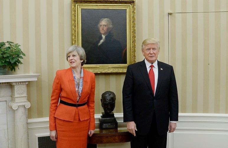Poslije upisivanja u knjigu posjetilaca Bijele kuće, Donald Trump i Theresa May su pozirali ispred biste Winstona Churchilla, koja je ponovno postavljena u Ovalni ured američkog predsjednika, nakon što ju je prethodno uklonio bivši predsjednik Barack Obama.