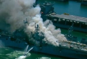 Vatrogasci se bore protiv plamena. Uzroci eksplozije koja je izazvala požar zasad nisu poznati. Glasnogovornica baze izjavila je da se ove nedjelje ujutro na brodu nalazi dvjesto mornara. USS Bonhomme Richard, koji je trenutno na održavanju u San Diegu, može ukrcati helikoptere i razne vrste amfibija.