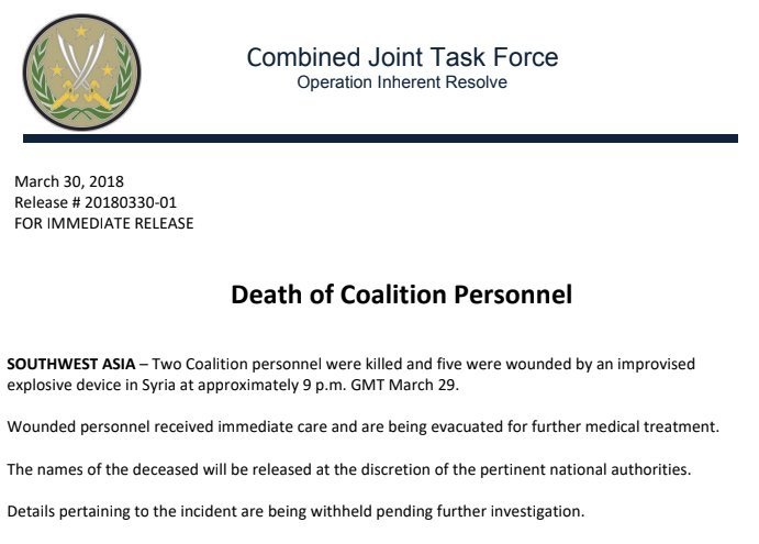 Prethodno je neslužbeno navedeno kako su u eksploziji u sjevernoj Siriji dva vojnika koalicije predvođene Sjedinjenim Državama ubijena, a petorica su ranjena.