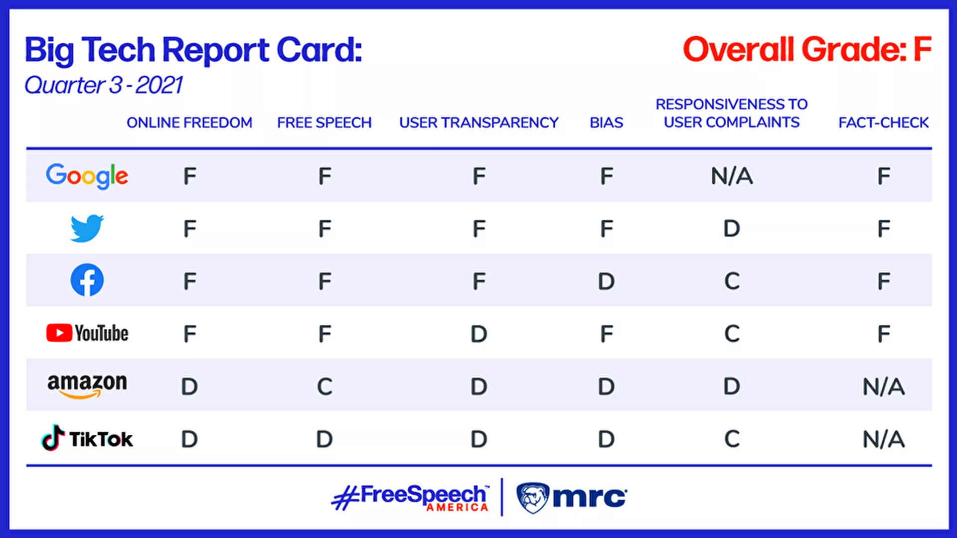 Prema izvještaju, cenzura je posebno zabrinjavajuća jer platforme „nisu imale mnogo dalje da padnu od svojih patetičnih rezultata u drugom kvartalu“. Na Google, Twitteru i Facebooku sloboda na mreži je nastavila da opada. I u ovom kvartalu je ponovo došlo do masovne cenzure konzervativnih informacija.