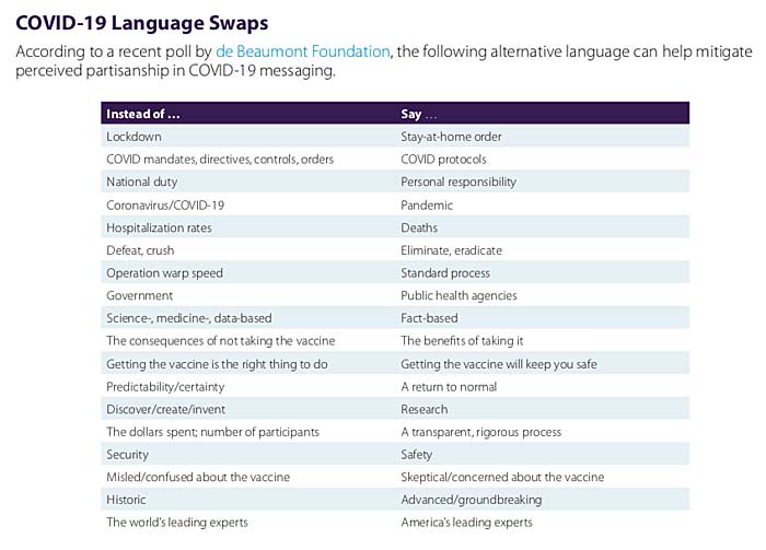 Razočaranje je, dakle, vidjeti da AMA upućuje ljekare kako dezinformisati javnost koristeći različite psihološke i jezičke alate. Možda je jedan od najeklatantnijih primjera toga preporučena “zamjena jezika COVID-19” detaljno navedena na stranici 9.