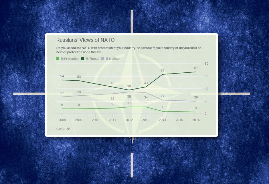Da su neutralni u odnosu na Sjevernoatlantski savez je reklo 20% ispitanika, a 3% ih čak smatra da NATO štiti Rusiju. Tijekom posljednjih pet godina, od 2012. do danas, broj onih koji NATO vide kao prijetnju je porastao za 29%.