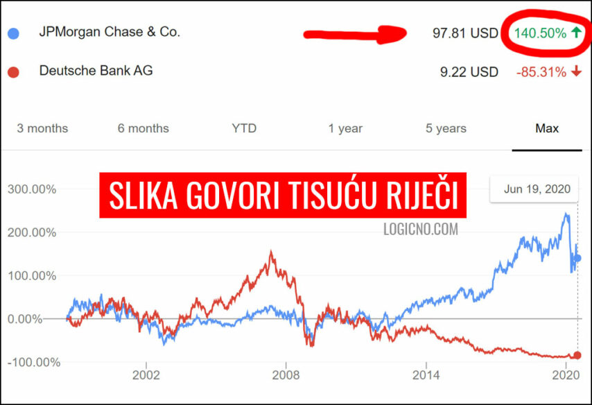 Znate li koja svjetska banka raste bez obzira na sve krize i koja na kraju stvara profit? To je ona banka koja je prodavala kompromitirane derivate, a što je uzrokovalo globalnu krizu 2008. godine. Radi se J. P. Morgan Chase & Co. Pogledajte vrijednost akcije ove banke od 1990. do danas na donjoj tabeli? Ove banke krize ne pogađaju, nego ih jačaju. Sličnih banka u svijetu nema više od 10 i one predstavljaju financijski sektor koji svijet drži u dužničkom ropstvu, stvarajući monetarnu depresiju i gospodarske krize. Ne radi se o nikakvoj teoriji zavjere, nego o jednostavnoj matematičkoj formuli razumljivoj osnovcu.