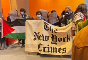 “Nastavit ćemo pozivati New York Times na odgovornost… za poticanje genocida!” čulo se kako prosvjednici skandiraju. “Ni više ni novčića, ni novčića, nema više novca za New York Times!”