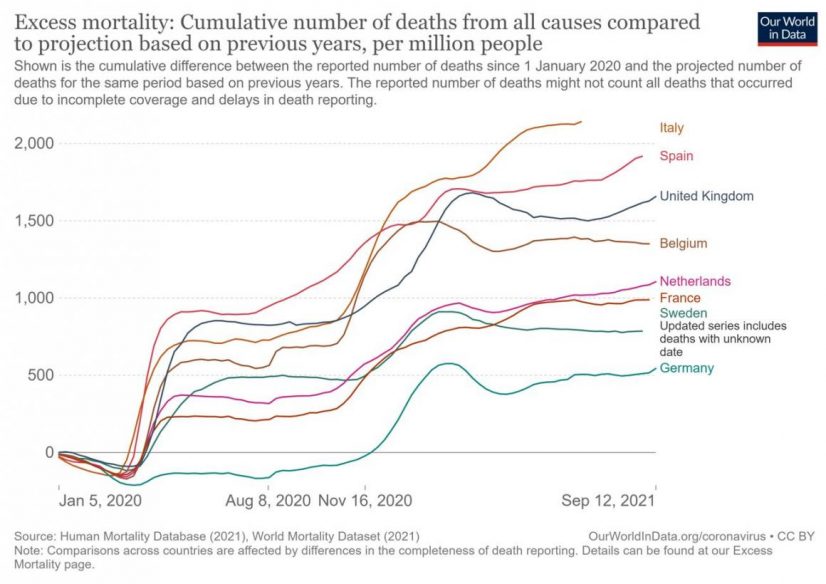 Na primjer, krajem kolovoza višak smrtnosti u Švedskoj iznosio je približno 785 na milijun ljudi. U Francuskoj je ukupno 988 na milijun, a u Španjolskoj 1.917 na milijun. U Ujedinjenom Kraljevstvu koje nije član EU, ukupno je 1.657 na milijun.