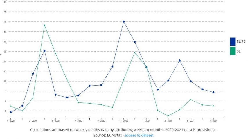 U razdoblju od veljače 2020. godine ukupni smrtni slučajevi (mjereni kao postotak prosjeka 2016-19.) Bili su niži u Švedskoj nego u “EU 27” u četrnaest od osamnaest mjeseci.