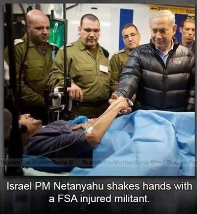 Netanyahu: “Hamas je ISIS i ISIS je Hamas“ je ovde viđen 2014. u Izraelskoj vojnoj bolnici kako želi brzi oporavak ISIS teroristi kamufiran kao FSA (Free Syrian Army), vojske finansirane od strane SAD da se bori protiv Assada u Siriji