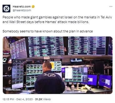 Insjderska trgovina: neke osobe su se pre 7. oktobra kladile protiv izraelskih deonica, baš kao što su određeni entiteti prodali avio akcije pred napad 11. septembra 2001. u New Yorku – što dokazuje da profit uvek nadmašuje patriotizam