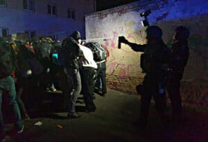 Prema navodima policije, sudionik je napao policajca, otrgnuo mu kacigu i bacio je preko kapije. “Policija je morala upotrijebiti biber sprej i palice kako bi se obranila od napada dijela nemirnih sudionika.”