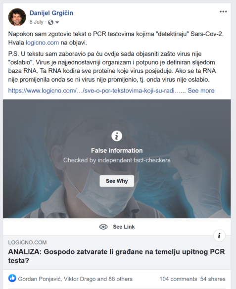 Poštovani, 8. srpnja 2020. godine na portalu logicno.com objavljen je tekst naslova: “ANALIZA: Gospodo zatvarate li građane na temelju upitnog PCR testa?“ autora Dr. sc. Danijela Grgičina. Navedeni tekst možete vidjeti na ovoj poveznici https://www.logicno.com/politika/sve-o-pcr-tekstovima-koji-su-radikalno-promijenili-nas-zivot.html