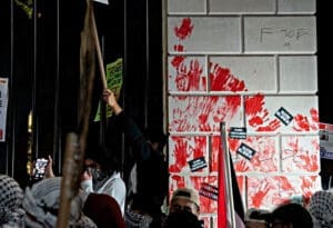 Propalestinski prosvjednici zaprljali su crvenom bojom sigurnosnu ogradu Bijele kuće u Washingtonu, DC u subotu navečer, a neki su pokušali probiti vrata, dok su osuđivali predsjednika Joea Bidena zbog podrške Izraelu.