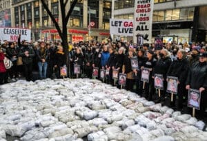 Grace Lyle, 64-godišnja demonstrantkinja, izjavila je: “Želimo skrenuti pažnju na činjenicu da je gotovo 10.000 djece, ne računajući druge žrtve, ubijeno u Gazi zbog nemilosrdnih zračnih udara i užasnih napada.”