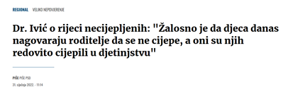 U ovom tekstu iz 30.1. možete pročitati još njegovim dramatičnih izjava i besramnog promoviranje cjepiva, poput ove: „Osjećate se pomalo uzaludno jer ste mogli spriječiti tolike smrti da su se ljudi cijepili, a sad dolaze u tako teškom stanju da im ne možete pomoći. To je depresivno. Tako se ekstremno i duboko proširila epidemija da nema stanovnika koji nije bio izložen infekciji. Prije se mjerama moglo ograničavati, ali sad je to moguće samo cijepljenjem- rekao je dr. Ivić pa rekao da je uzalud nagovarati one koji su odlučili da se neće cijepiti.“