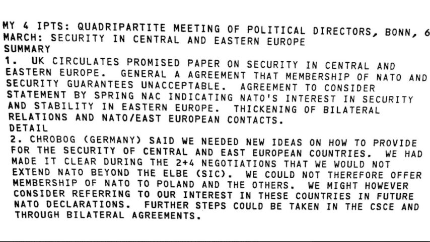 „Jasno smo stavili do znanja tokom pregovora 2+4 da nećemo proširiti NATO dalje od Elbe“, rekao je zapadnonjemački diplomata Juergen Hrobog. „Zbog toga ne možemo ponuditi Poljskoj i drugima članstvo u NATO“.