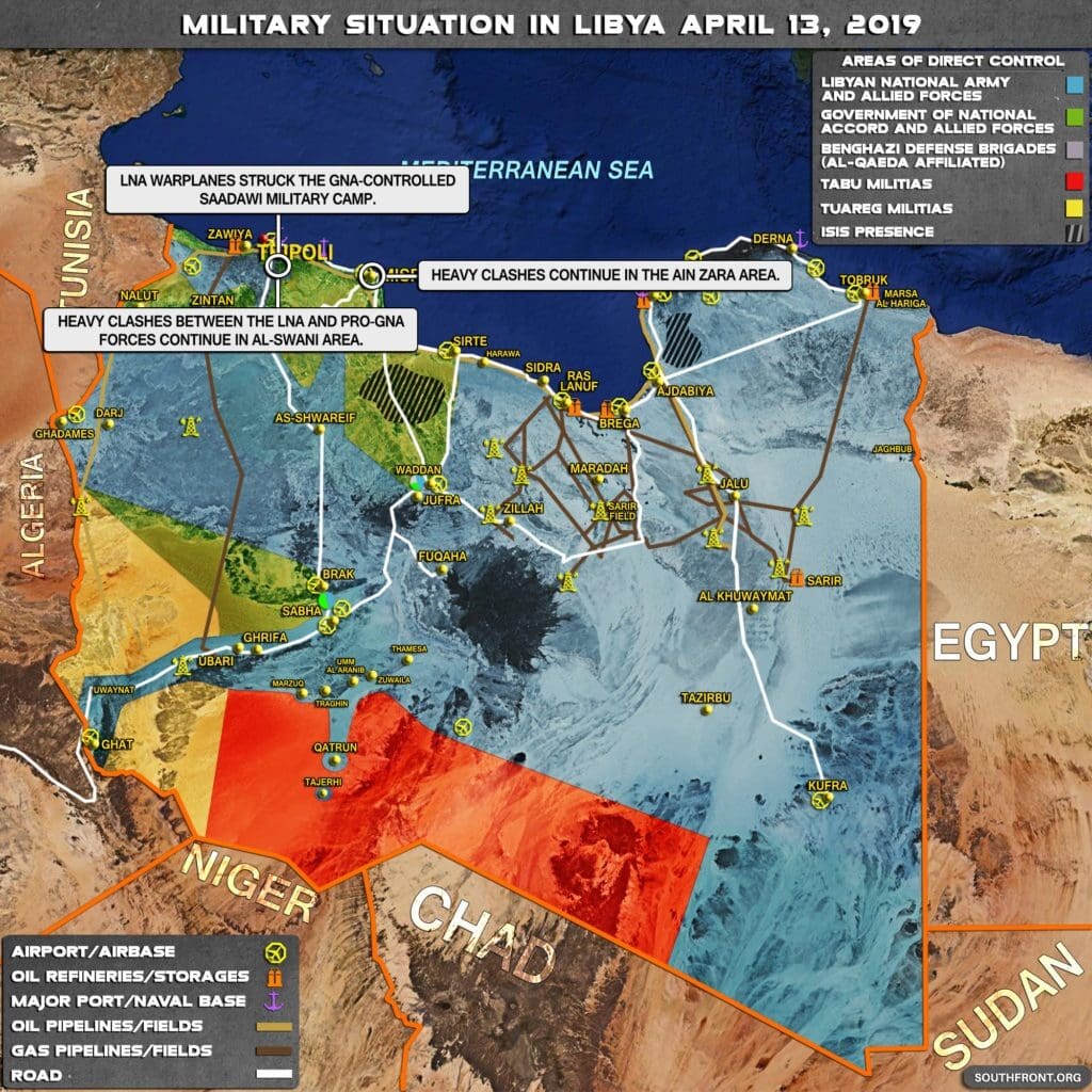 Tijekom 12. i 13 travnja su i general Haftar je libijski narodne armije i snage Vlade nacionalnog sporazuma tvrdile da su ostvarile značajan napredak u borbi za Tripoli, dok bi se napredak u borbama za islamističke milicije mogao svesti na očuvanje utvrde u Ain Zari, kroz koju LNA mora proći za uspostavu pune kontrole nad prijestolnicom.