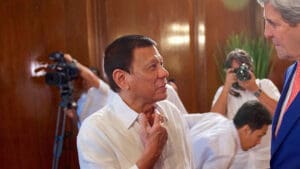 On je najavio približavanje Kini i izgradnju boljih odnosa dviju zemalja. Ove zemlje će, tokom njegove četvorodnevne posjete, potpisati više sporazuma, uključujući i koncesiju za korištenje dijela spornih teritorija u Južnom kineskom moru, a za koje je sud u Hagu kazao da ne mogu biti predmetom vlasništva niti jedne od dviju država koje se spore oko istih. Ovim sporazumom nestaje veliko breme koje je opterećivalo odnose dviju zemalja i otvara put koaliranju Filipina sa jakim saveznikom u tom regionu.