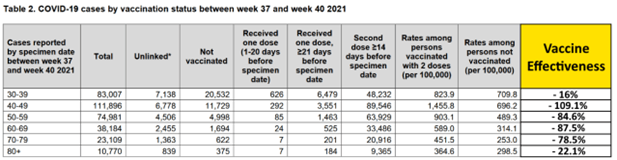 Kombinirajući brojke za sve dobne skupine starije od 30 godina uspjeli smo izračunati prosječnu učinkovitost  tzv. cjepiva od -66,2 %, a to definitivno vidimo u broju potvrđenih slučajeva prema statusu cijepljenja. Između 37. i 40. tjedna 2021. godine bilo je 52.849 potvrđenih slučajeva Covid-19 u necijepljenih starijih od 30 godina, 13.444 potvrđenih slučajeva u djelomično cijepljenih preko 30 godina, i zastrašujućih 265.474 potvrđenih slučajeva u potpuno cijepljenih starijih od 30 godina.