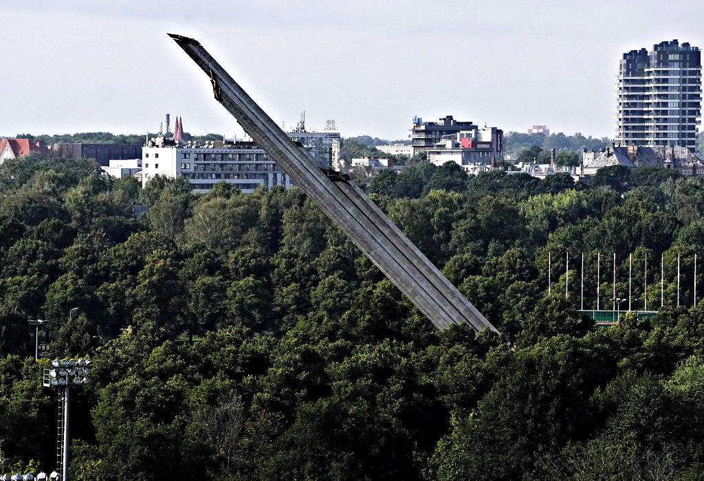 Betonski toranj od 80 metara ukrašen crvenim petokrakim zvijezdama na vrhu bio je istaknuto obilježje u središtu Rige sve dok se nije srušio u obližnje jezero nakon što su ga teški strojevi srušili, dok su promatrači klicali i pljeskali.