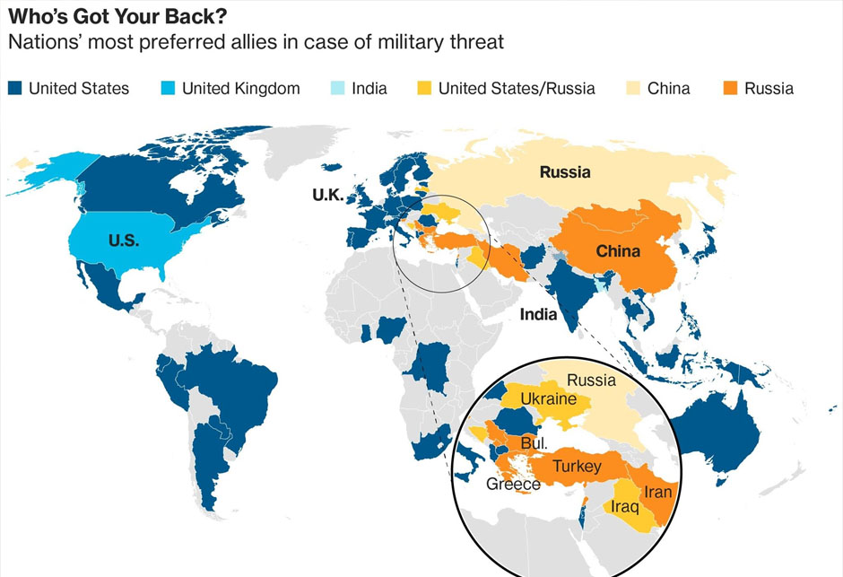Daleko najveći broj zemalja u kojima je Gallup proveo anketu je izabrao za glavnom obrambenog partnera odabrao SAD, što sugerira da je Amerika i dalje jedina vojna sila u svijetu globalnog razmjera, piše Bloomberg.