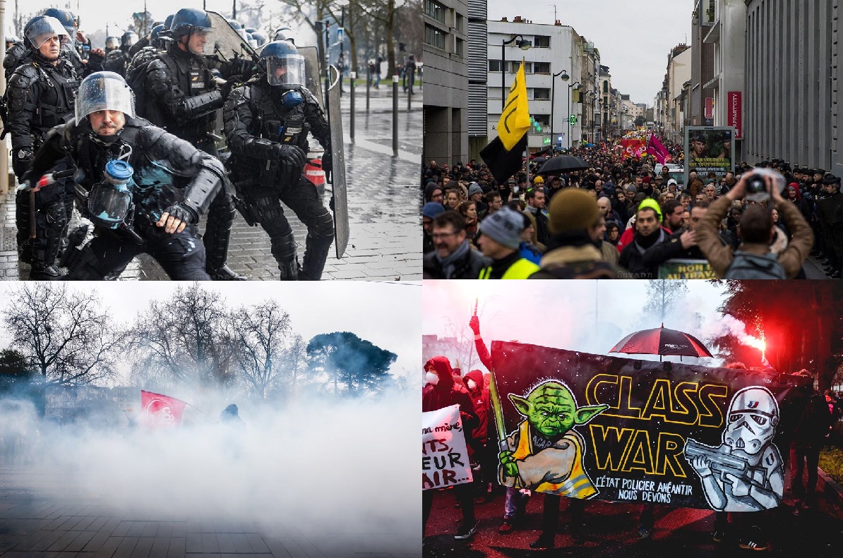 U velikoj povorci je bilo učenika i studenata, radnika javnog i privatnog sektora, sindikalista i Žutih prsluka. Ono što vrijedi napomenuti, ovaj ustanak nije ni „lijevi“ ni „desni“, iako su formalni pokretači vođe ljevičarskog sindikata CGT. Kako policija nije mogla spriječiti povorku da ide željeno rutom, počeo se koristiti suzavac. Logičan odgovor dijela prosvjednika je bio bacanje kamenja i žute boje na policiju, a onda je uslijedila kiša zaglušujućih bombi i brutalna uhićenja.