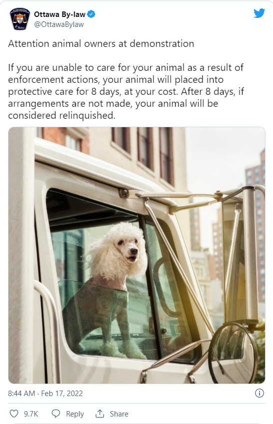 U novom porazu za demokraciju, agencija za provedbu zakona Ottawe jasno je stavila do znanja da nisu iznad oduzimanja kućnih ljubimaca, kako bi ugušili prosvjede. “Pozor vlasnicima životinja na [demonstraciji]: Ako se ne možete brinuti za svoju životinju zbog mjera provođenja, vaša će životinja [biti] stavljena na zaštitnu skrb na 8 dana, o vašem trošku. Nakon 8 dana, ako se ne dogovore, vaša će se životinja smatrati napuštenom”, stoji u tvitu.