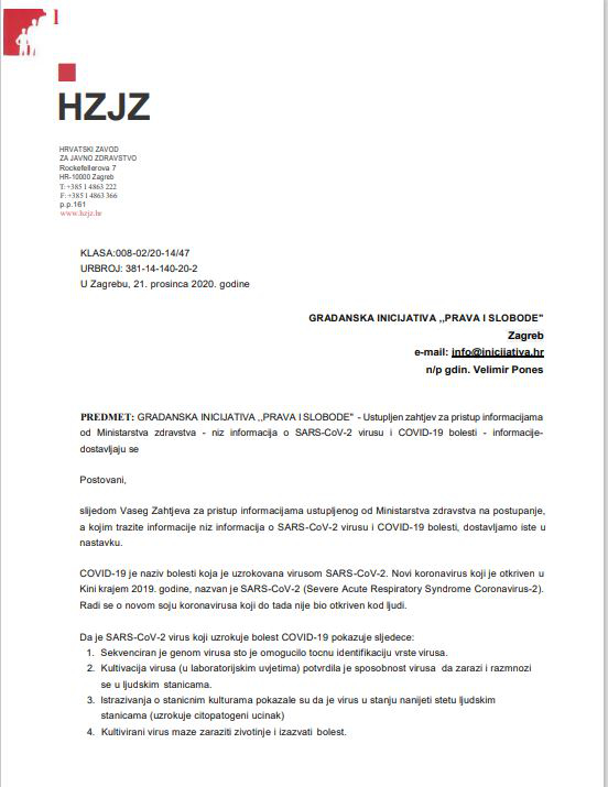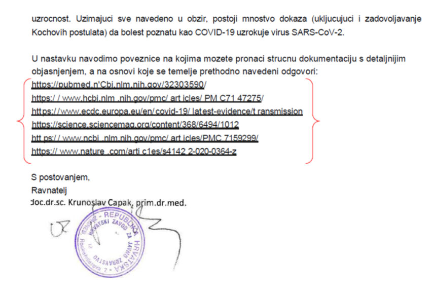 Time što je HZJZ kao odgovor na dopis i kao svoj temelj poslao studije ili članke koji su datirani poslije 11. ožujka potvrdio je da nije postojala nikakva valjana osnova za donošenje „Odluke o proglašenju epidemije bolesti COVID-19 uzrokovane virusom SARS-CoV-2“, odnosno da Odluka donesena bez ikakve podloge i kao takva zapravo uopće ne postoji jer iza nje apsolutno ništa ne stoji što je ravnatelj Hrvatskoga zavoda za javno zdravstvo Krunoslav Capak potvrdio svojim potpisom i pečatom Zavoda.