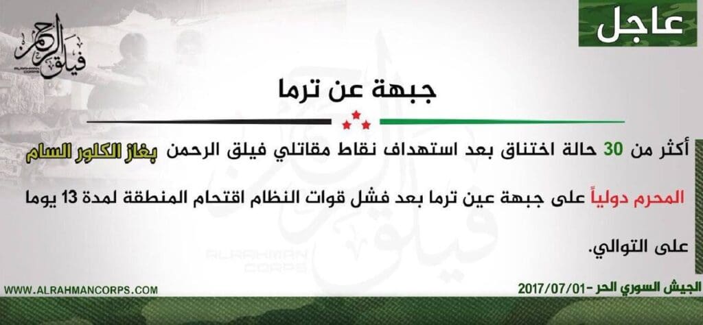Iako su teroristi Faylaq Al-Rahmana, koji gube nadzor nad Ayn Tarmom u Istočnoj Gouti, naveli kako je kemijski napad režimskih snaga uzrokovao više od 30 smrtnih slučajeva, a za napad se koristio plin klorin, za sada mediji nisu uopće prenijeli vijest, kao ni dužnosnici u Washingtonu.
