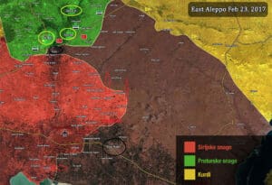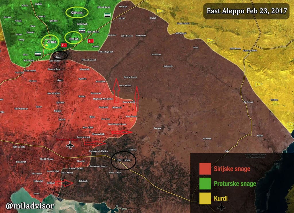 Međutim, to je operativno područje sirijskih snaga, koje su do danas zauzele desetine sela i strateških uzvisina, a malo nedostaje da se spoje s kurdskim snagama na istoku u širem području Manbija. 23. veljače su specijalne “Tigar” snage oslobodile još dva sela sjeverno od Deir Hafera, a danas su ušli u Qasr al Bureij, Misrihah i Um Kharaz i zaposjeli uzvisinu Sulayman. Sada praktično nadziru cijelo sjeverno područje od Deir Hafera i turske snage nemaju mogućnost prolaza prema gradu, osim ako ne žele ući u izravan sukob sa sirijskom vojskom.