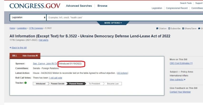 Republikanski senator John Cornyn je 19. januara 2022. godine predstavio Zakon o zajmu za odbranu demokratije u Ukrajini, poznat i kao S.3522. Ovo navodi zvanična stranica zakona Congress.gov. Istog datuma, zajedno su ga sponzorisali senatori Benjamin Cardin, Jeanne Shaheen i Roger Wicker.