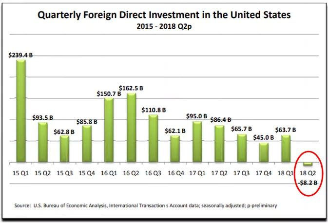 Bilo je predviđeno da će se izravna strana ulaganja u Sjedinjene Države povećati. Uostalom, tvrtke imaju koristi od ogromnih poreznih olakšica Trumpove administracije, a prema službenim podacima američko gospodarstvo stoji dobro. Ali, je li baš tako? U drugom kvartalu 2018. godine, po prvi put u dugom razdoblju, zabilježen je neto odljev kapitala.