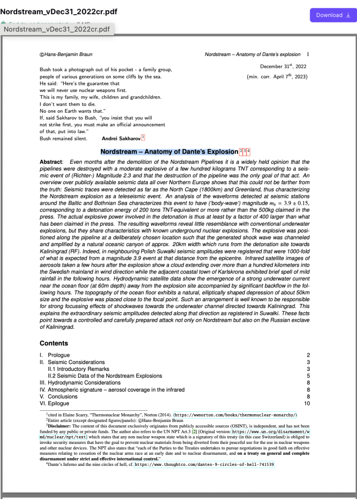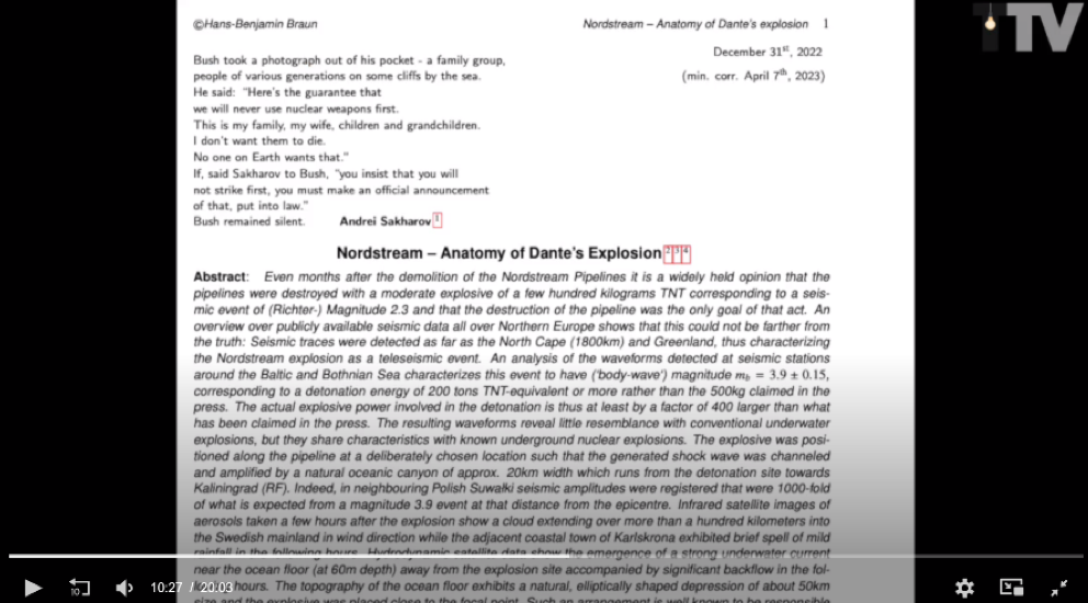 “Seizmički tragovi prijavljeni su do Nord Capa (1.800 km od detonacije) i Grenlanda, što je okarakterisalo eksploziju Nordstream-a kao teleseizmički događaj. Analiza talasnih oblika otkrivenih na seizmičkim stanicama oko Baltičkog i Botničkog mora karakteriše ovaj događaj kao …. imaju energiju detonacije od 200 tona ekvivalenta TNT-a ili više, umjesto 500 kg kako se tvrdi u štampi”, kaže profesor Braun u svom izvještaju.