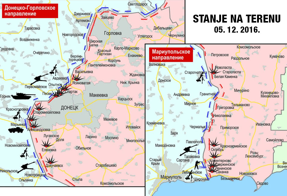 Ukrajinski tenkovi su viđeni i u selu Novoselovka, 10 km od linije razdvajanja u blizini mjesta Jasinovataja. Blizu grada Donjecka je primijećena fiksna lokacija četiri minobacača kalibra 120 mm, dok je u području Krasnogorovke primijećena samohodna haubica “Akacija”, kalibra 152 mm, i to na samo 3 km od linije razdvajanja.