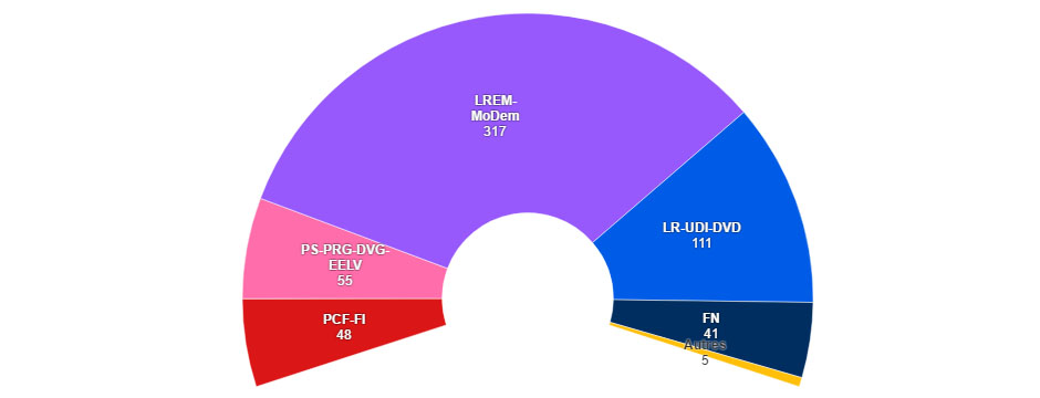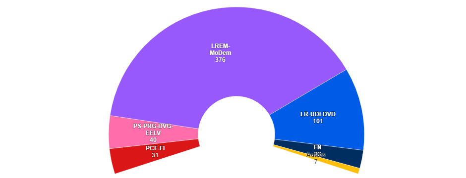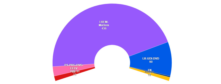 Naime, prema projekciji koju je objavio Ipsos / Sopra Steria, pokret Emmanuela Macrona i njegovi saveznici, centristi MoDem, nakon drugog kruga parlamentarnih izbora 18. lipnja bi mogli kontrolirati između 415 i 455 mjesta.