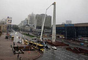 Fotografije i video snimci koji su se pojavili na društvenim mrežama i koje su objavile neke ukrajinske novinske kuće u subotu prikazuju gradske radnike kako rastavljaju i skidaju zlatnu zvijezdu na kruni spomenika visokog 40 metara.