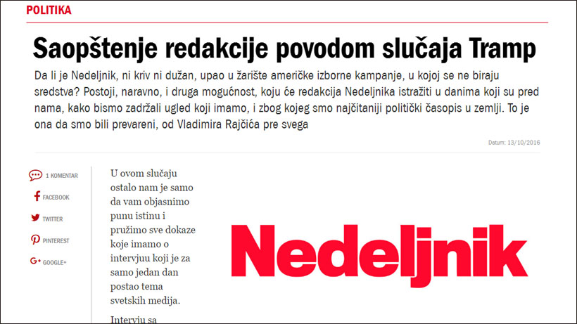 Nakon što je Trampov izborni štab osporio intervju, srbijanski “Nedeljnik” je isti povukao sa svoje internet prezentacije. Redakcija je iznijela svoju stranu priče na svom portalu pitajući se da li je taj list “ni kriv, ni dužan” postao žrtvom američke izborne kampanje “u kojoj se ne biraju sredstva“. Oni su ostavili prostora i mogućnosti da ih je prevario Vladimir Rajčić, srbijanski glumac koji živi u Americi, a koji ih je, navodno, spojio sa Trampom. Rajčić se takođe oglasio u vezi s incidentom, kazavši kako posjeduje dokaze o tome da je intervju vjerodostojan te da će ih ubrzo objelodaniti na CNN-u.