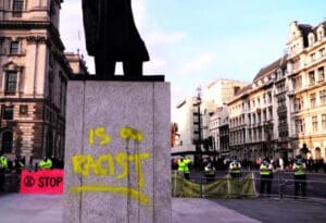 Mladić je primijećen kako sprejom slika riječi: “On je rasist”, na podnožju brončanog kipa Churchilla, baš u trenutku kada se ”pobuna protiv izumiranja” koja se održala u četvrtak, rasplamsala. Čovjek je uhvaćen na licu mjesta i uhićen pod optužbom da je grafitima oštećivao javno dobro.