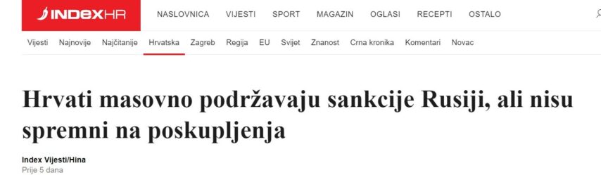 Dakle, kaže Index da Hrvati masovno podržavaju sankcije Rusiji, a kao izvor za taj podatka navode – Europsku Komisiju – nedemokratsko i neizabrano tijelo koje upravlja Europskom Unijom. Index piše: „Po istraživanju koje je prošloga tjedna objavila Europska komisija, 80 posto građana EU slaže se s ekonomskim sankcijama ruskoj vladi, kompanijama i pojedincima, a u Hrvatskoj sa sankcijama se slaže 82 posto ispitanika, priopćio je ured Europskog parlamenta danas.“