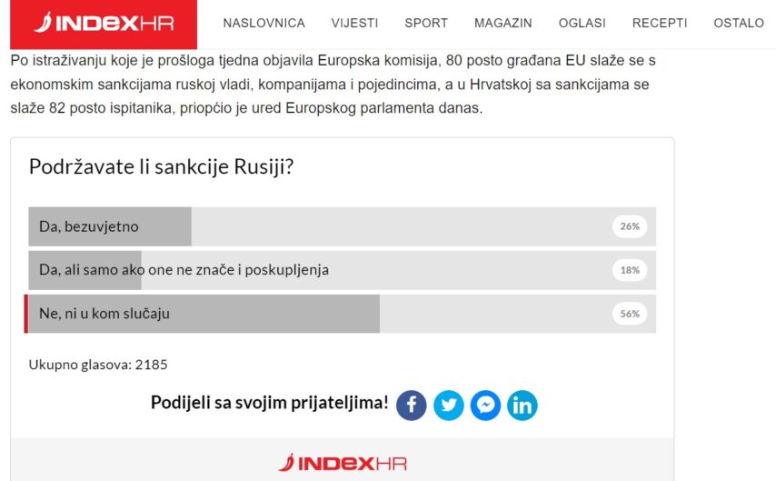 Ispada da samo 26 % podržava sankcije bezuvjetno, 18 % podržava ako to ne znači poskupljenja, a čak 56 % posto ne podržava sankcije ni u kom slučaju. Dakle, čak ni većina njihovih čitatelja ne podržava sankcije – a znamo da Index čitaju uglavnom naivni ljudi koji vjeruju propagandi. Kad bi mi na našem portalu postavili istu anketu, vjerojatno bi preko 90 % reklo da ne podržava sankcije ni u kom slučaju.