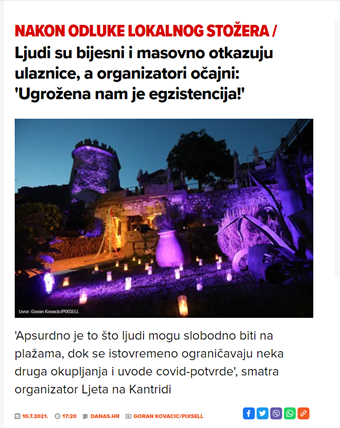 Dakle govorimo o turističkoj sezoni kad su okupljanja na otvorenom uobičajene pojave u centrima svih turističkih mjesta. Zapravo organizacija pozornice i muzike u centru mjesta, je nešto što je uobičajeno, i spada u neizostavni dio turističkog iskustva. Sve je to većinom moralo biti otkazano. Velika većina kulturnih događaja i koncerata je već otkazana u Rijeci i okolnim mjestima. Turisti su ostali zakinuti za taj dio iskustva, a našim mladim ljudima je praktički zabranjena zabava u klubovima, pa čak i onim kafićima i beach barovima koji se nalaze na otvorenom. Ali istovremeno, ti isti ljudi se mogu bez problema okupljati na nakrcanim plažama. Zbilja, radi li se tu o epidemiološkim mjerama, ili o namjernom uništavanju ekonomije i prisiljavanju na cjepivo, o čemu smo već puno puta pisali?