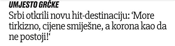 Smijesno iz bih cak i iz srbije narod ide u albaniju na ljetovanje a mnogima ce i to preci u naviku.Uvijek spominju ovdje neki patriotizam oslobodjenje hrvatske i dr gluposti pa ne treba im veci neprijatelj od njihovih duznosnika mislim na hrvatsku mada i drugim u okruzenju je isto.Ima ona narodna cuvaj se neprijatelja a jos vise svog