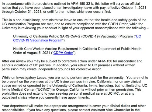 Evo najnovijeg poteza Kalifornijskog sveučilišta kao odgovor na moju tužbu na Saveznom sudu kojom se osporava njihov mandat cjepiva u ime osoba oporavljenih od Covida s prirodnim imunitetom. Prošlog četvrtka, 30. rujna u 17:03, primio sam ovo pismo sa Sveučilišta u kojem me obavještavaju da sam od sljedećeg jutra stavljen na “istražni dopust” zbog nepoštivanja mandata za cjepivo. Nisam imala priliku kontaktirati svoje pacijente, studente, stanovnike ili kolege i obavijestiti ih da ću nestati na mjesec dana. Umjesto da čeka da sud donese odluku o mom slučaju, Sveučilište je poduzelo preventivne mjere: