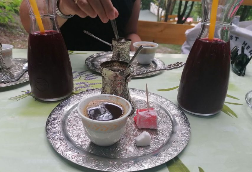 Prije nego smo krenuli u šetnju, sjeli smo i popili prave domaće sokove od višnje i aronije. Dok nas služi, djevojka nam objašnjava da se radi o 100 % prirodnim sokovima bez vode i šećera. Doista sokovi su predobri. U kompleksu Bosanske piramide nije dozvoljen alkohol. Sve što konzumnirate prirodno je i domaće. Čak i osoblje koje radi su stanovnici Visokog i okoline. Male drvene trgovine su pažljivo odabrane od strane Semira Osmanagića. Promovira se domaća kreacija.