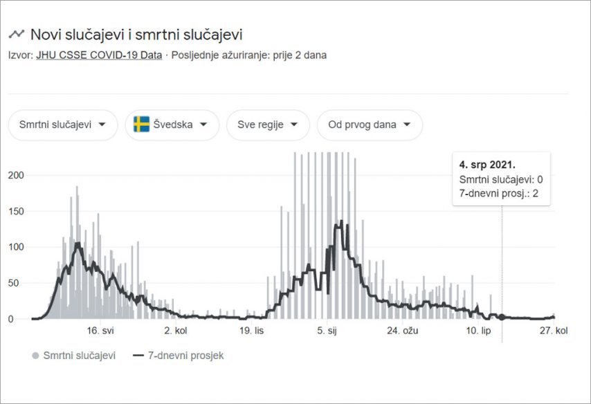 Zašto ne spomenete predsjednika vlade Belgije, koji je jasno rekao da takvih mjere u Belgiji neće biti. Zašto ne spomenete Veliku Britaniju, gdje su sve mjere ukinute i gdje je smrtnost na najnižoj razini? Zašto šutite o Švedskoj koja nije uvodila nikakve restriktivne mjere, a danas je smrtnost od Covida na nuli. Ne vjerujete? Pogledajte donji grafikon, pa nam dajte logično objašnjenje, koje me, bit ću iskren, uopće ne interesira.
